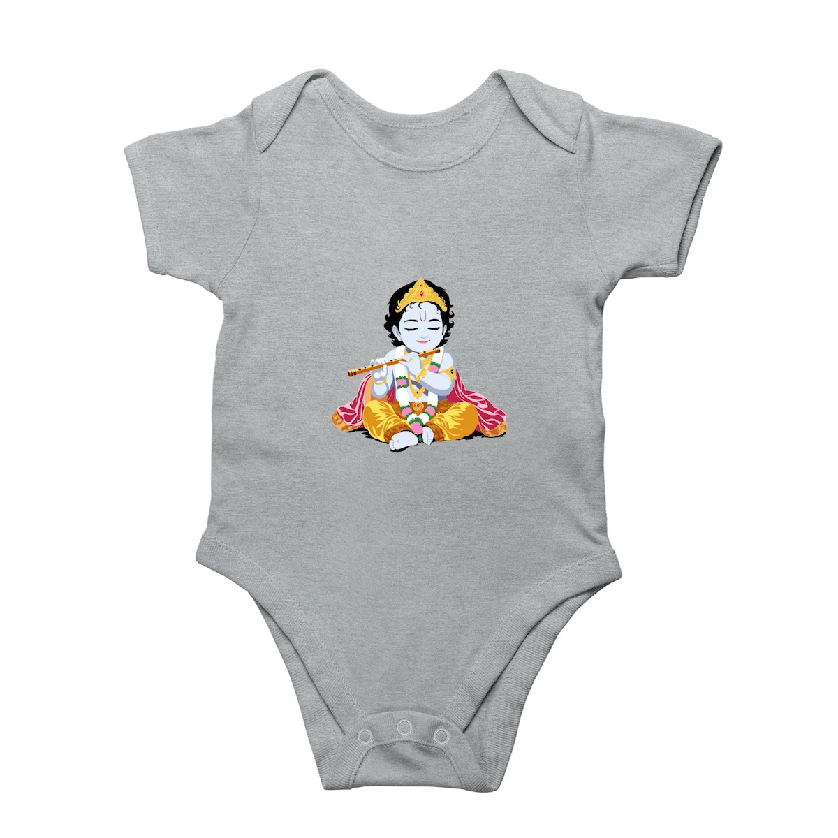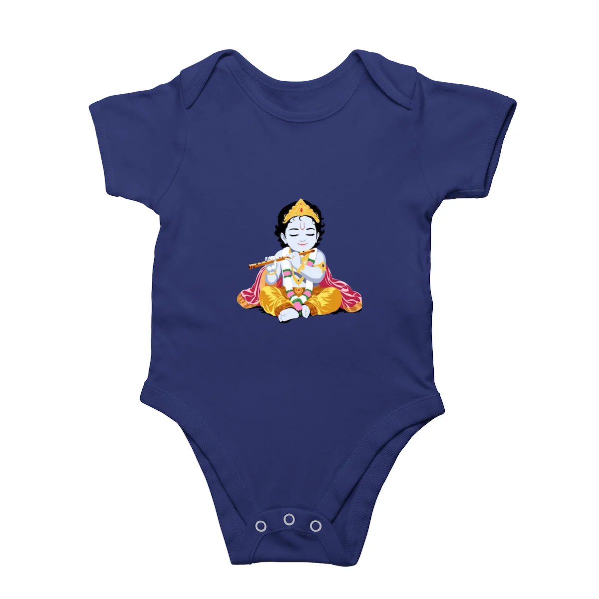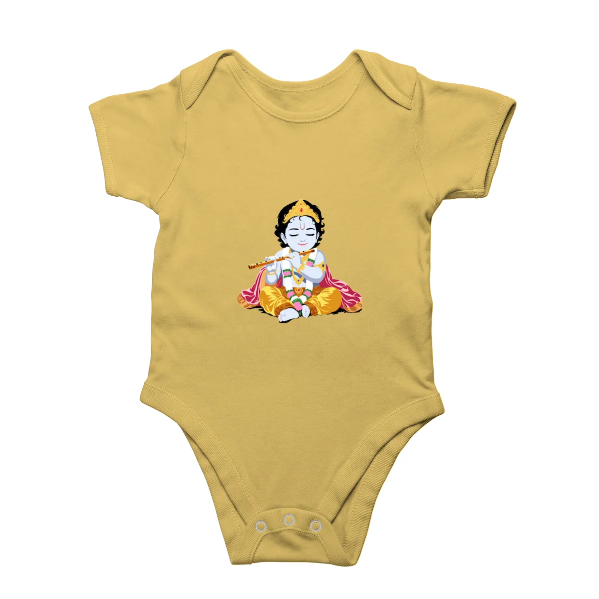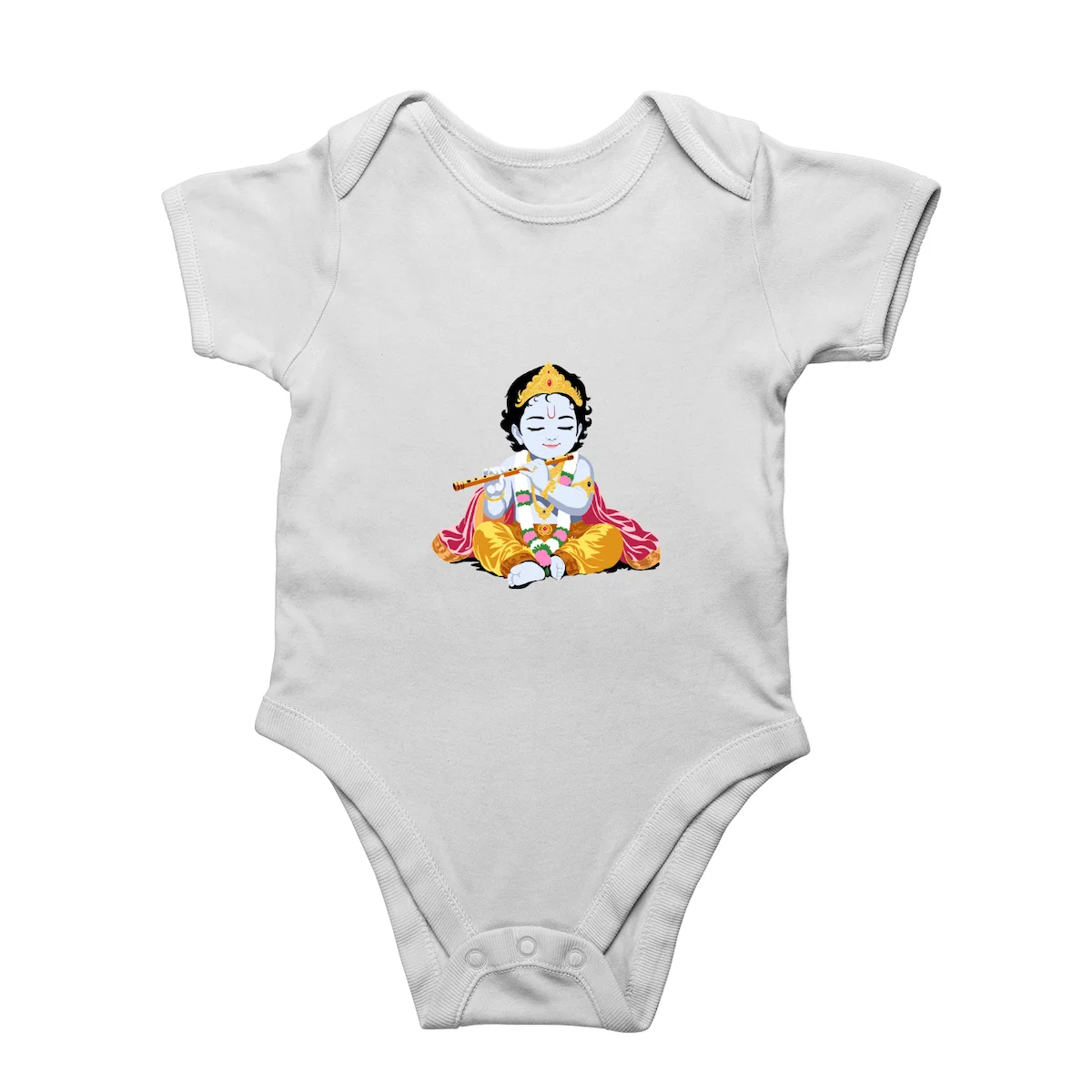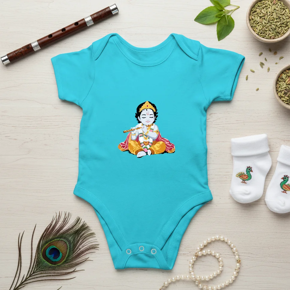 Bring divine charm and peaceful vibes to your little one’s wardrobe with our Krishna Playing Flute Baby Romper. Featuring an adorable illustration of Lord Krishna playing the flute, this unisex baby romper beautifully reflects innocence, joy, and devotion—perfect for newborns, infants, and toddlers.